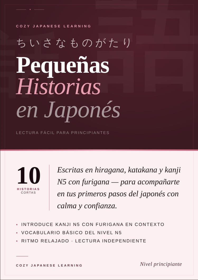Mis libros siguen esta filosofía: un concepto a la vez, japonés real desde la primera página, historias que hacen que la práctica se sienta como leer en lugar de estudiar, y un ritmo que te da espacio para asimilar de verdad lo que estás aprendiendo.