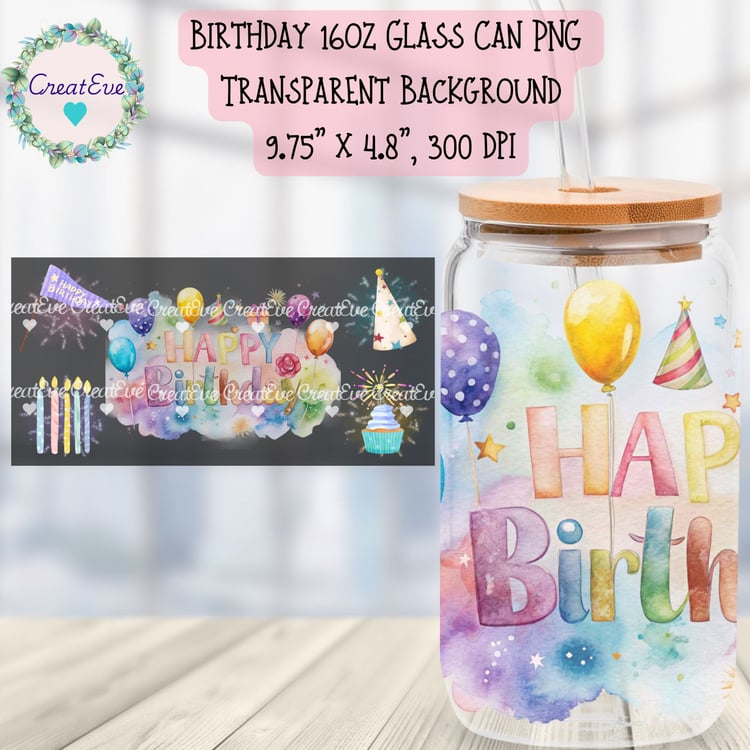 Birthday 16oz Glass Can PNG, 300dpi, 9.75" x 4.8"