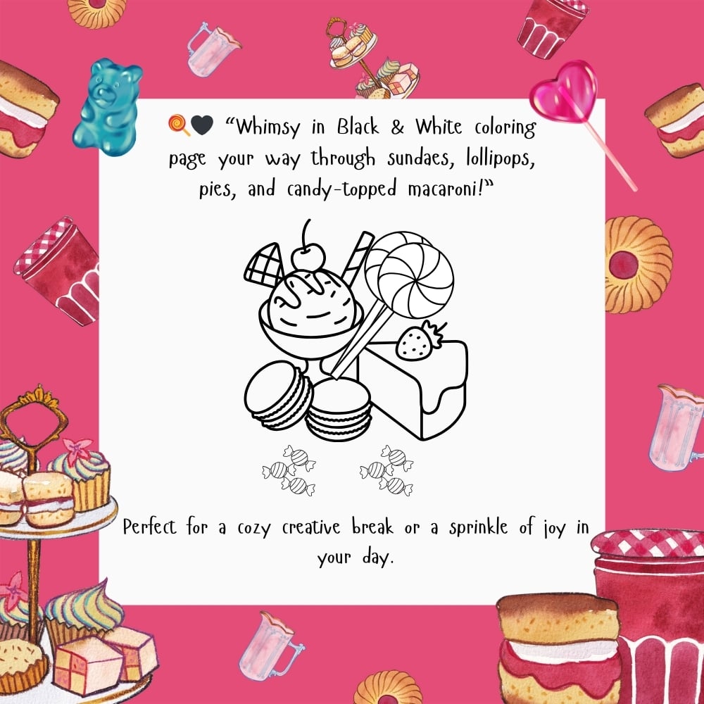 🍰🖤 Color Me Sweet: A Dessert Daydream 🎨✨ Get ready to treat your creativity to a sugar-sprinkled escape! This 52-page black & white digital coloring book is bursting with whimsical desserts from towering cakes and frosty ice cream cones to cozy slices of pie, cheerful lollipops, and candy-covered surprises.