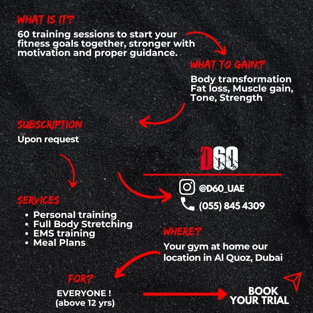 The D60 program consists of 12 weeks Training, Nutrition, Electric Muscle Stimulation, Deep Muscle Tissue Stretching, Recovery Sessions. The program was designed with the aim of burning the excess fat in the body, strengthen muscle fibres, so you can have that toned lean body.