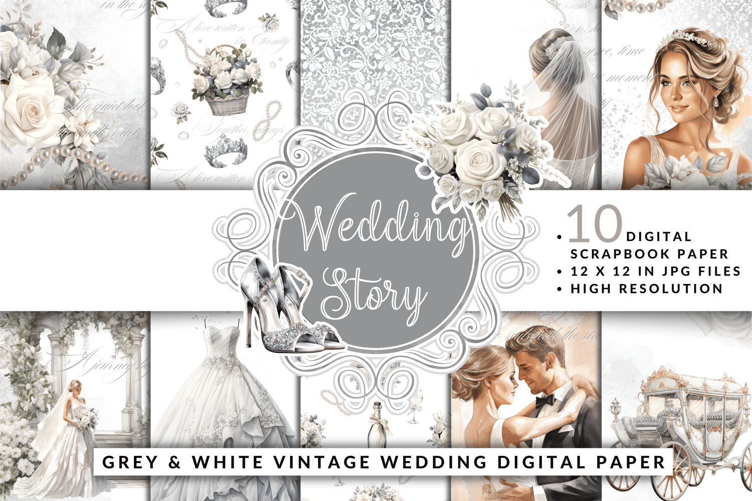 Grey White Vintage Wedding Digital Paper
