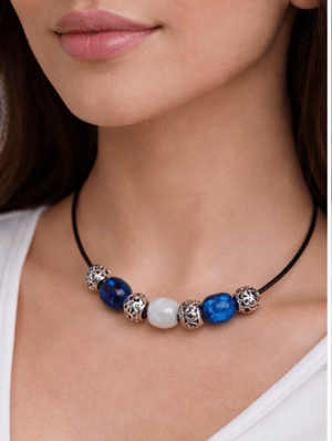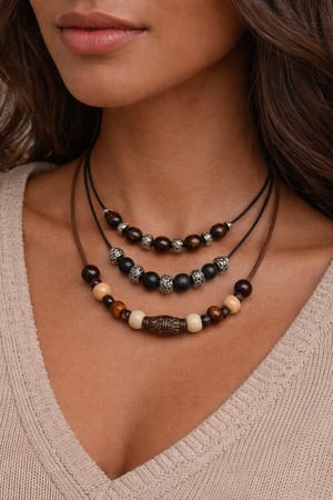 Beaded necklaces featuring blue and silver tones or earthy neutrals are especially popular. These colors pair effortlessly with linen dresses, light sweaters, and everyday basics.