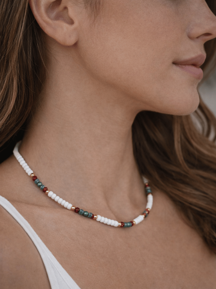 White & Turquoise Boho Beaded Necklace with Silver Accent