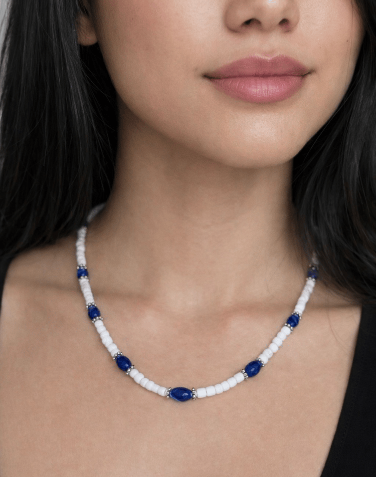 Handmade Blue & White Beaded Necklace – Minimalist Coastal Jewelry