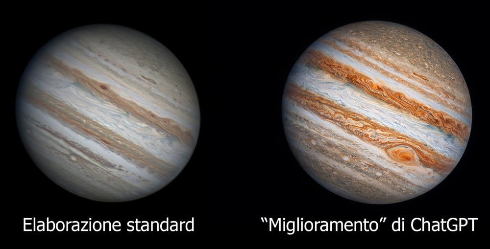 Ovviamente ChatGPT, o chi per lui, ha semplicemente creato una nuova immagine sintetica di Giove, senza alcuna aderenza con la nostra iniziale. Questo è un modo palese di capire che qualcosa è andato storto e se pubblicassimo questa nuova “versione” lo faremmo in chiara malafede.
