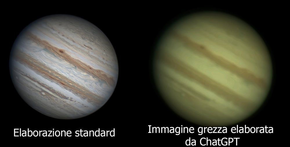 Anche con Giove le cose non vanno bene. Dare in pasto un'immagine già elaborata a qualsiasi software IA produce, nel migliore dei casi, contrasti esagerati, dettagli troppo piccoli e forme scolpite. Un pianeta gassoso non è così!