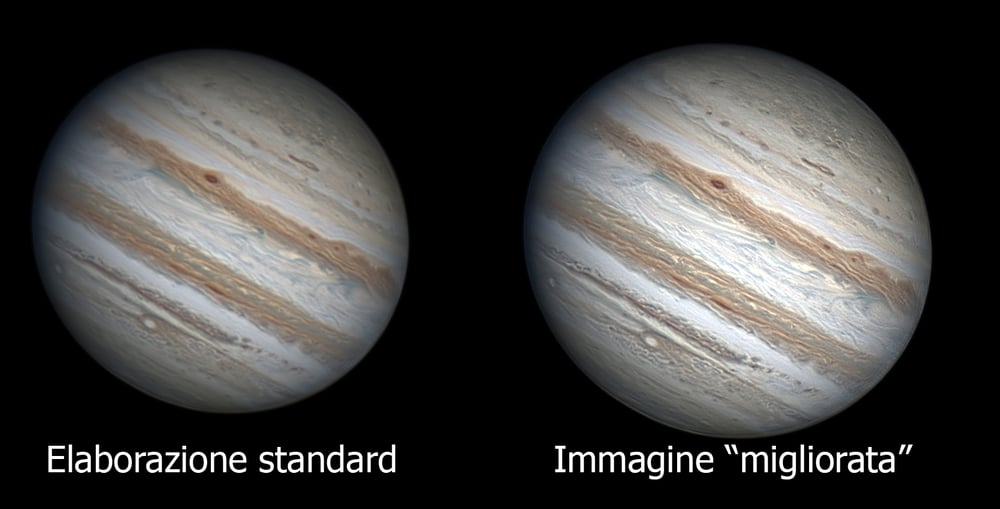 Quando elaboriamo un’immagine planetaria, frutto dello stacking di diverse centinaia o migliaia di singoli fotogrammi, applichiamo di solito dei filtri di contrasto (wavelet, maschere sfocate). Sono delle funzioni matematiche più o meno complesse che hanno l’obiettivo unico di mostrare ai nostri occhi tutti i dettagli catturati durante la ripresa, che nell’immagine grezza sono invisibili, ma presenti. Di conseguenza, i filtri di contrasto dovrebbero rendere visibile tutta l’informazione già catturata, senza alterarne la forma e le dimensioni.