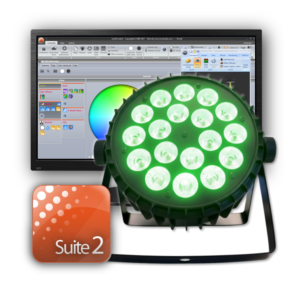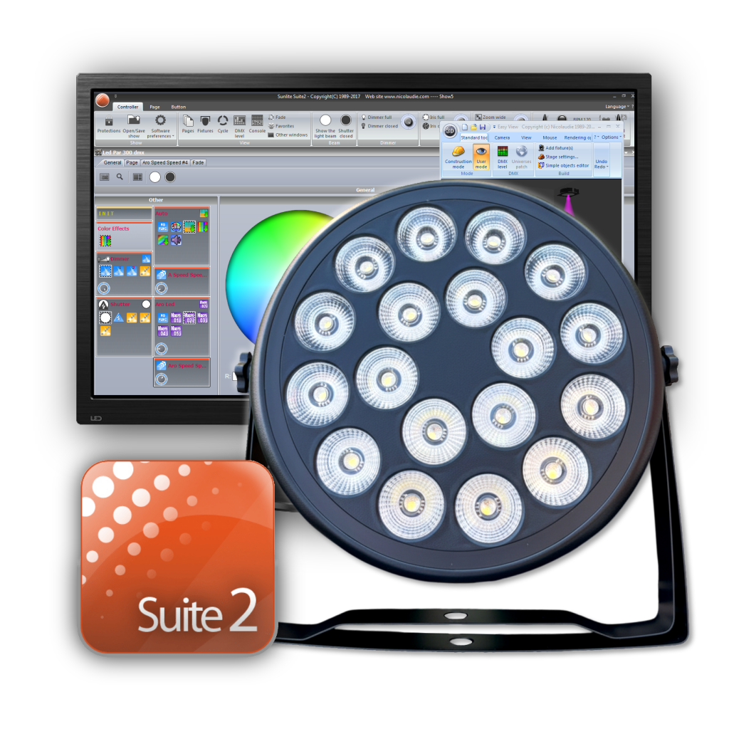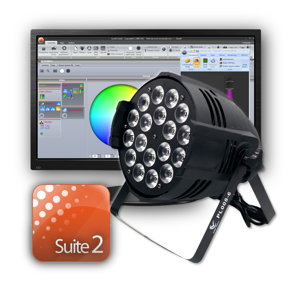 Librería de Sunlite Suite 2 P/ Led Par 300 Dmx de GBR ( 6-10CH 18 leds RGBW con Aro Led )