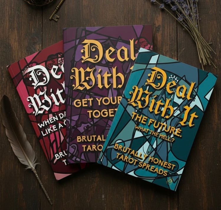 Deal With It Tarot makes guided journals full of tarot spreads and painfully accurate prompts designed to help you figure your shit out. We ask the right questions so you can finally stop spiraling and start getting somewhere.