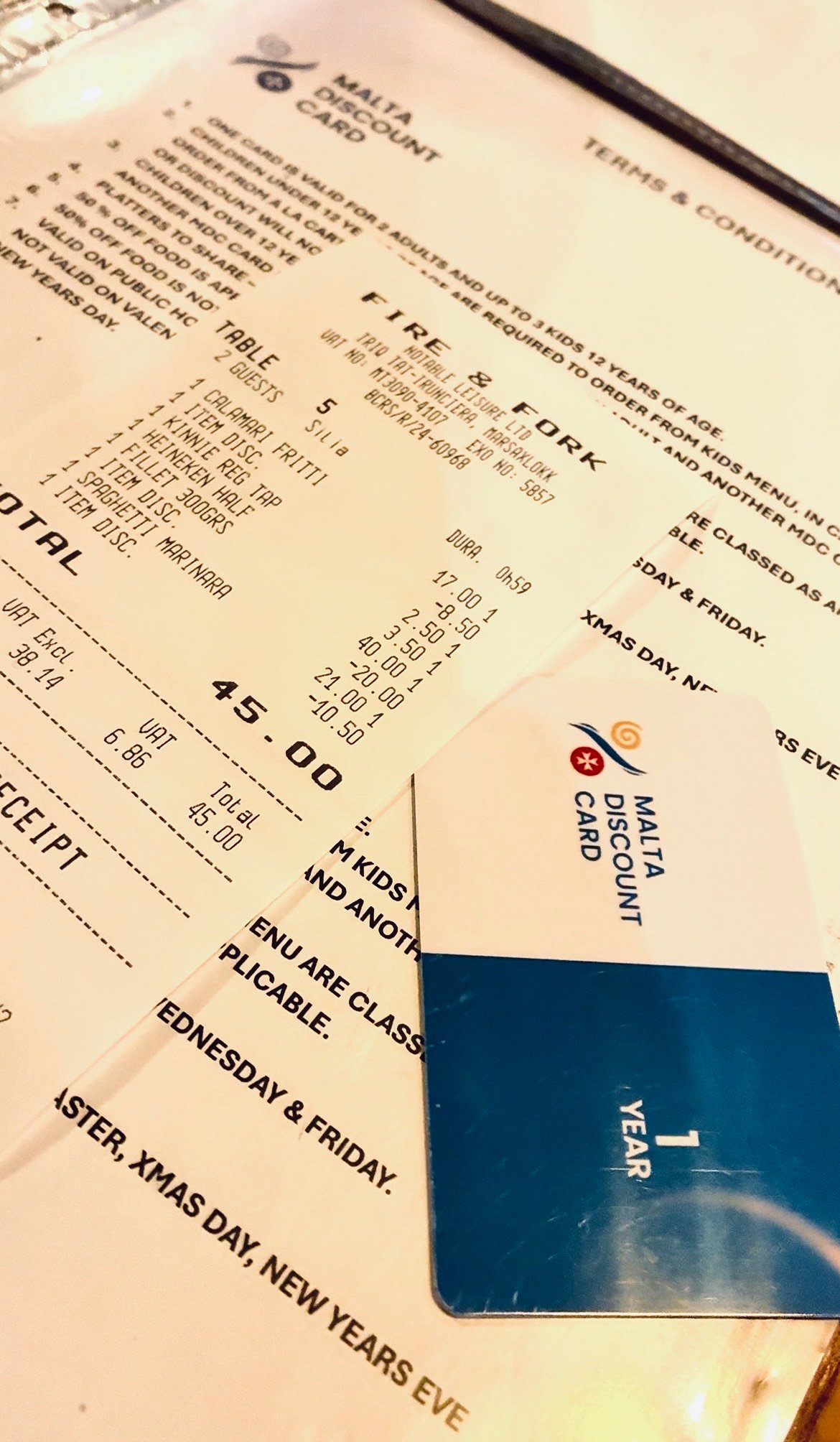 🧾 Receipt proof! Our bill at Fire & Fork, Marsaxlokk was €84, but with the Malta Discount Card, we paid only €45 🙌💰 Enjoy 50% off every week, while discounts on exotic meats are available on Wednesdays & Fridays only. One of the best value dining deals in Malta! 💸