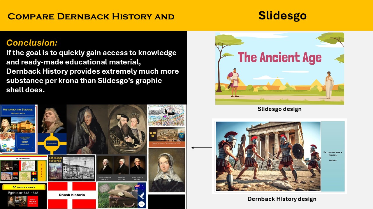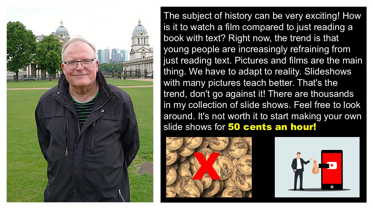 The subject of history can be very exciting! How is it to watch a film compared to just reading a book with text? Right now, the trend is that young people are increasingly refraining from just reading text. Pictures and films are the main thing. We have to adapt to reality. Slideshows with many pictures teach better. That's the trend, don't go against it! There are thousands in my collection of slide shows. Feel free to look around. It's not worth it to start making your own slide shows for 50 cents per hour!