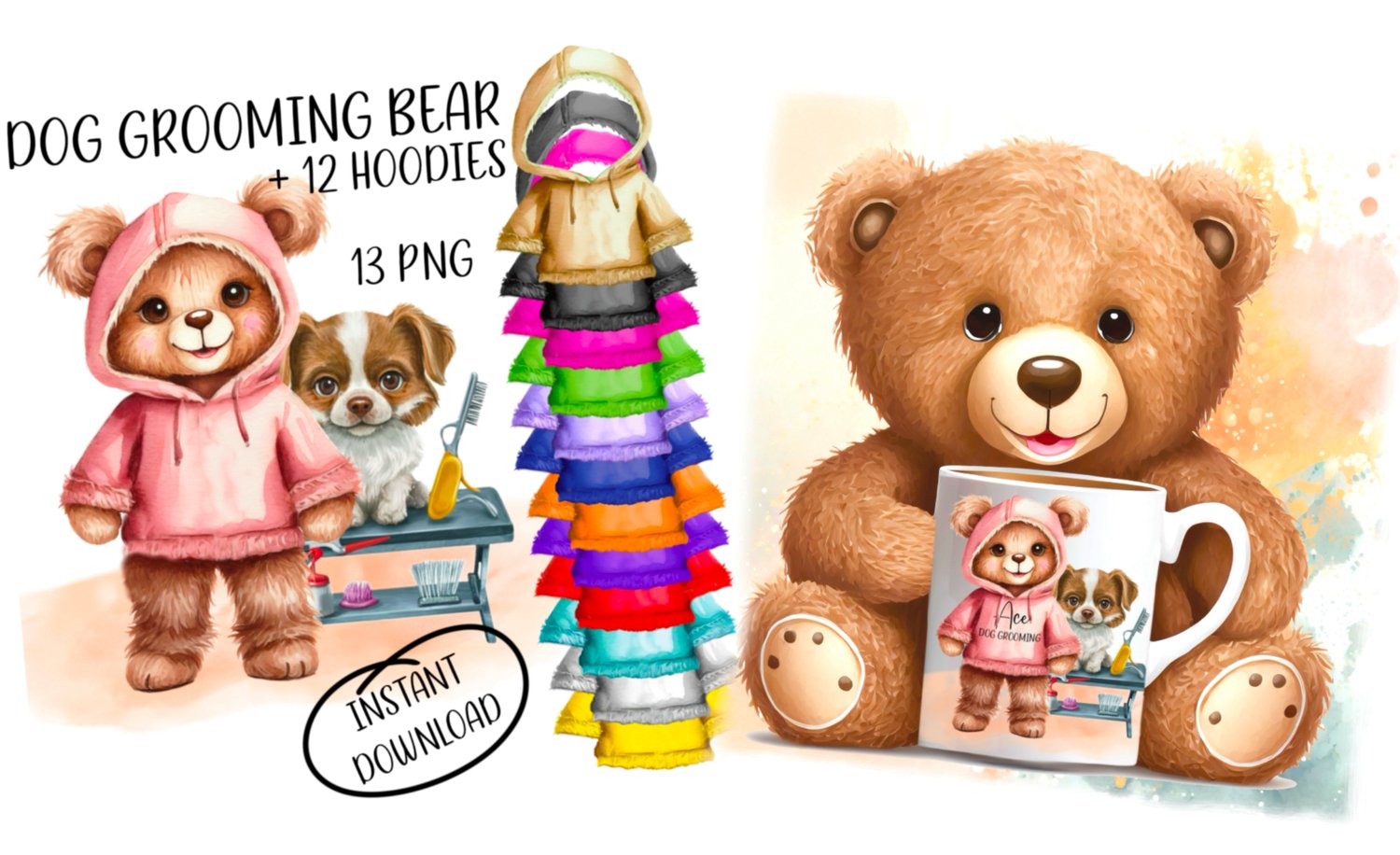 Cute teddy bear business logo, dog groomer, main graphic plus 12 hoodie, mix n match. Sublimation, print, personalise. PNG.