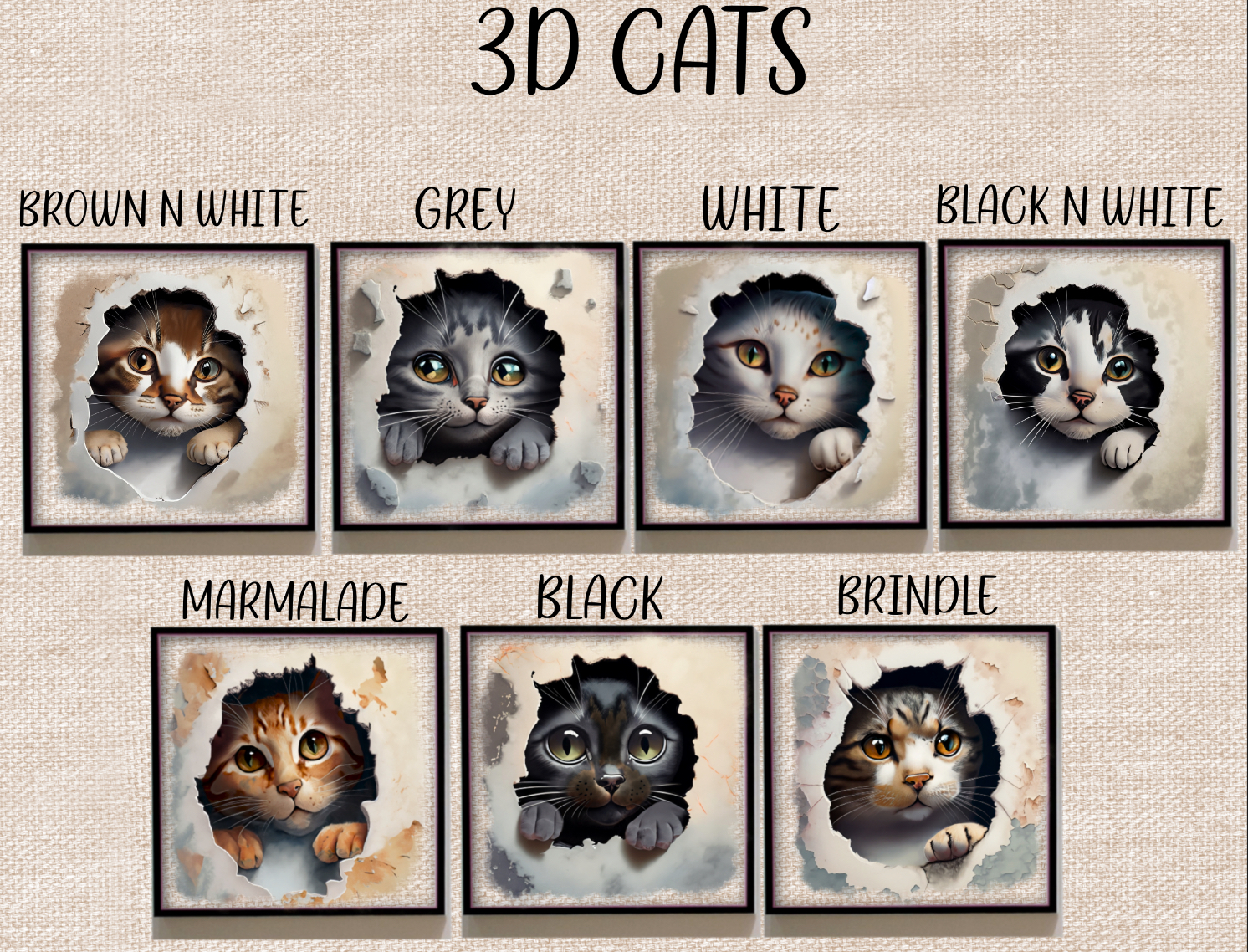 Cracked wall cats. Black, grey, white, marmalade, brown and white, black and white and brindle included in this bundle. Beautiful cats peeking through a hole in the wall, 3D.