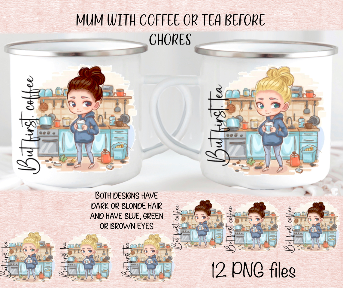 Girl with coffee/tea & messy kitchen, text “But first, coffee”/“..tea”.12 PNGs. Dark/blonde hair options, blue/brown/green eyes. Personalise.