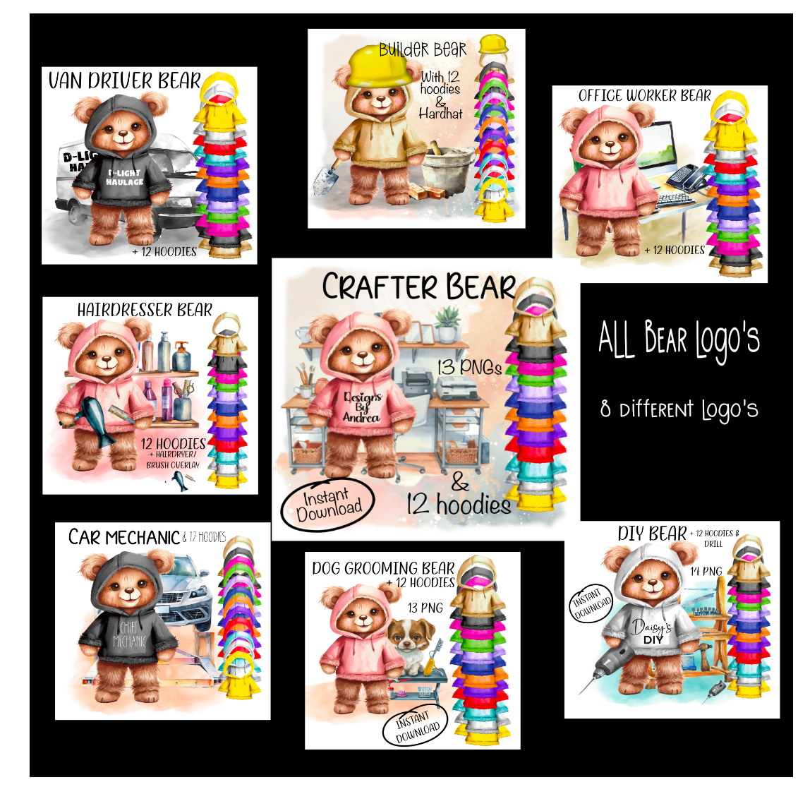 8 cute bear logo designs; Van Driver, Builder, Office Worker, Hairdresser, Crafter, Car mechanic, Dog groomer, DIY. Sublimation, PNG