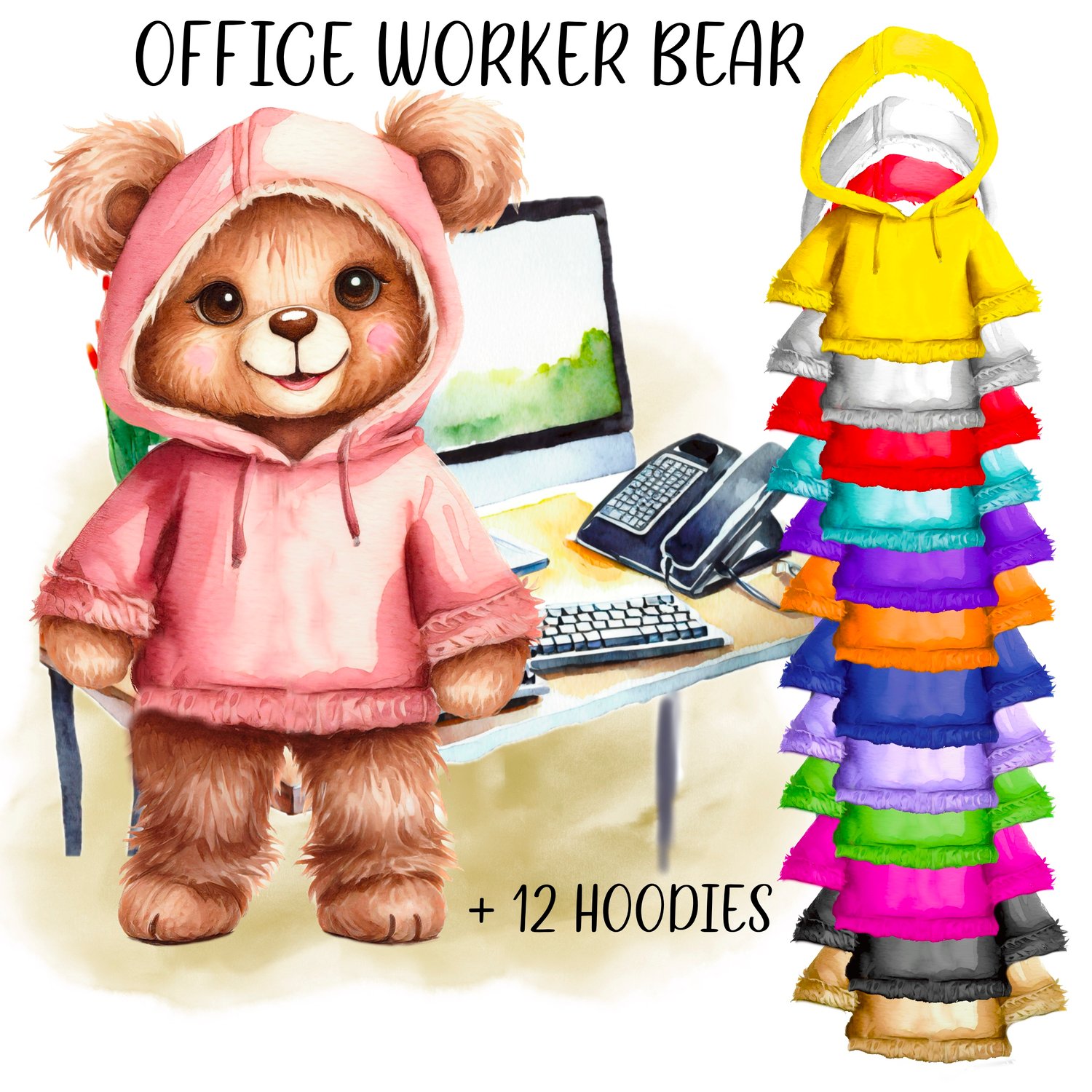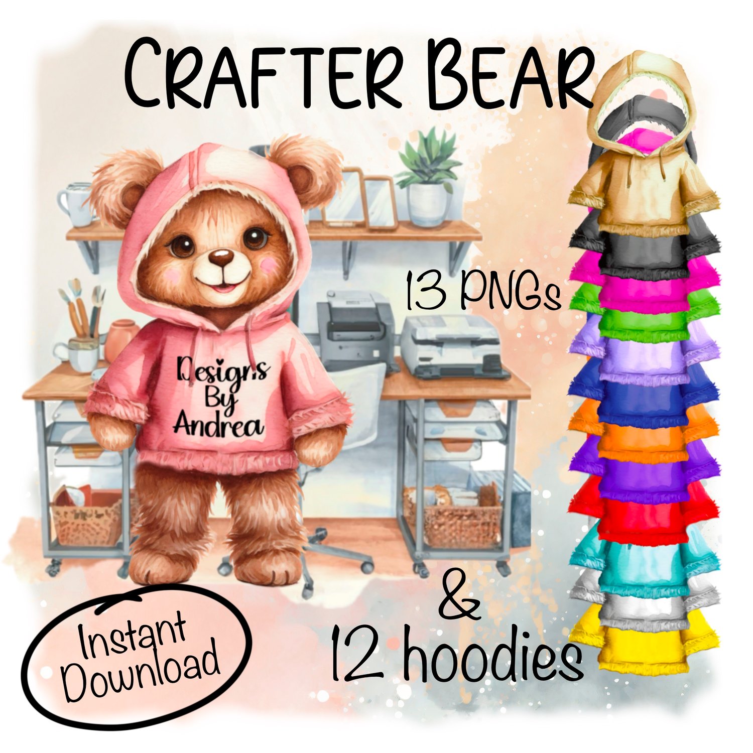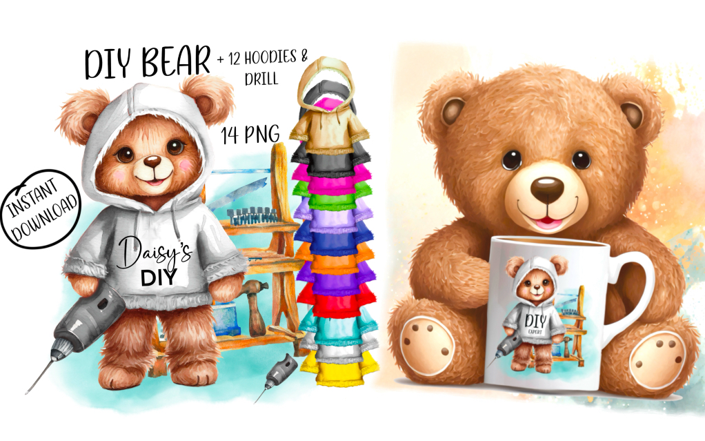 Cute teddy bear business logo, van driver, with van graphic and 12 hoodie clipart to mix and match. Sublimation, print, personalise. PNG.