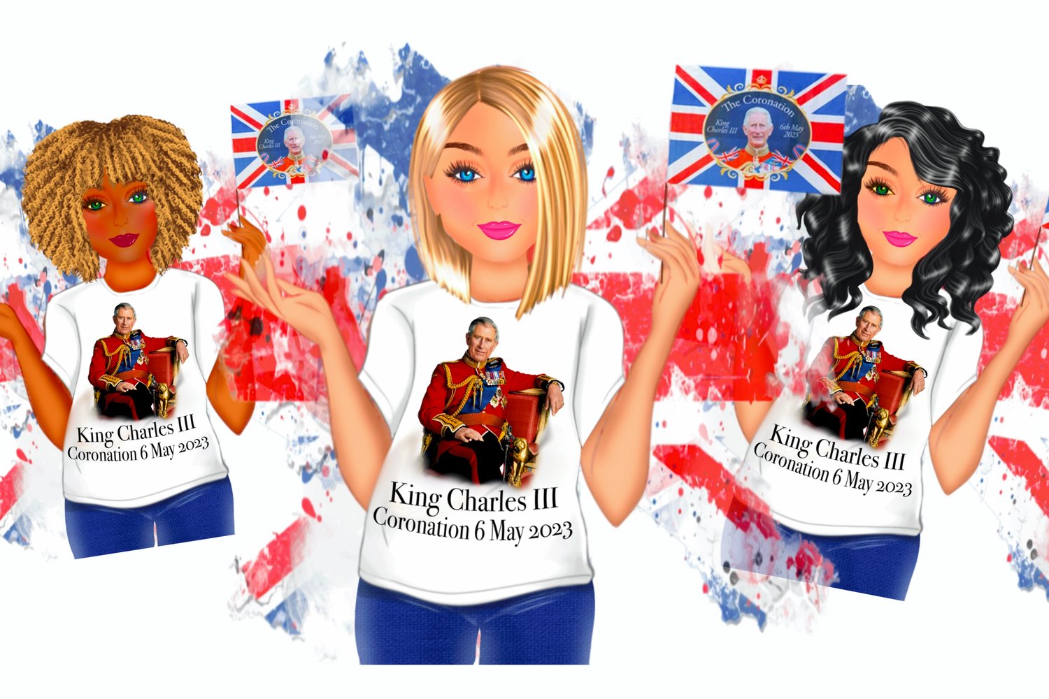 Coronation girls. 45 individual girls wearing coronation t shirts and waving the coronation flag on a Union Jack background.