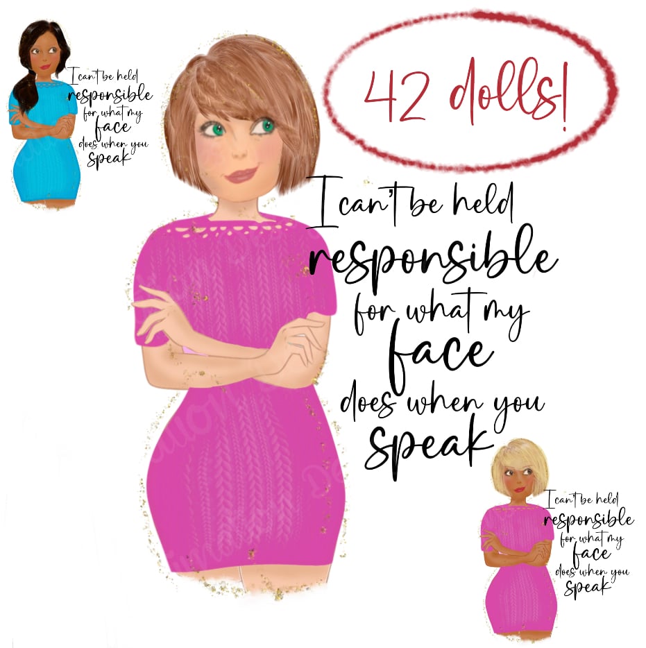 Girl, female doll clipart bundle. 82 PNGs. Make your own doll. Choice of skin colour, pose, outfits, hair, eyes, shoes. Sublimation