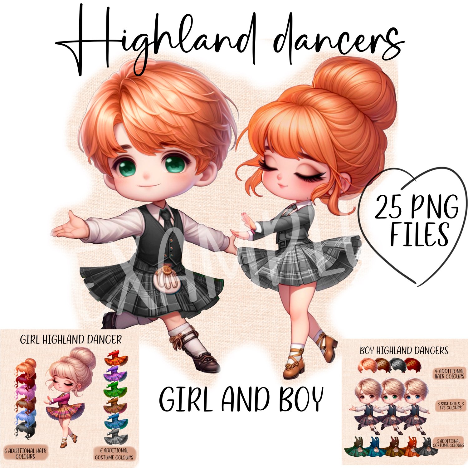 Beautiful boy and girl Highland Chibi dancer dolls. 25 PNGs, hair and costume clipart. Sublimation, print. Instant Download.