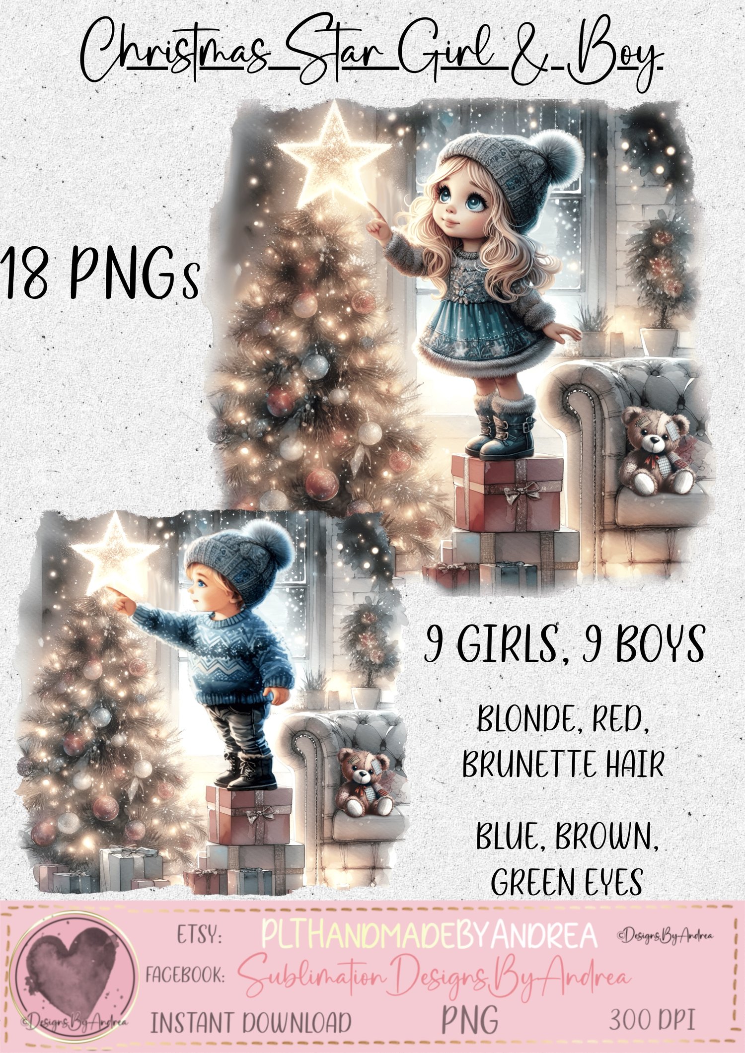 Cute Elf boy & girl Christmas design. 3 adorable boys, 3 adorable girls. 10 PNGs. Blonde, brunette, redhead.