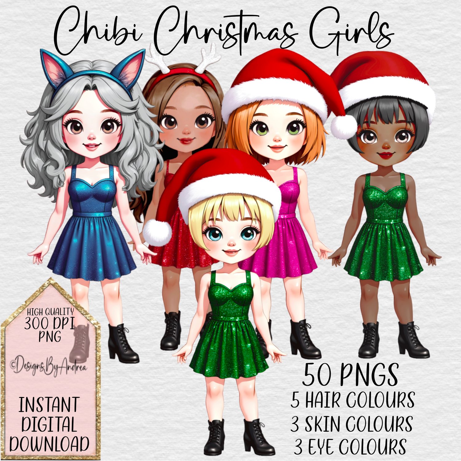 Christmas Chibi Girls Clipart: 50 PNGs for Sublimation