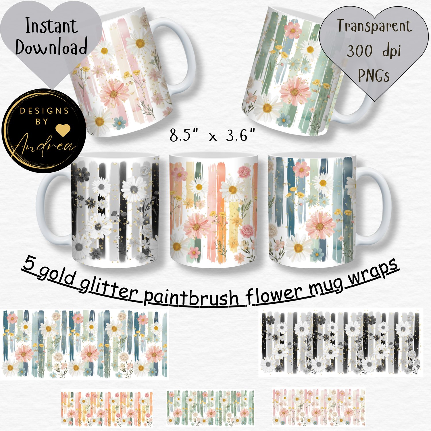 Gold Glitter Flower mug wrap PNG + JPEG Bundle – 5 Floral Paintbrush Designs | Instant Download