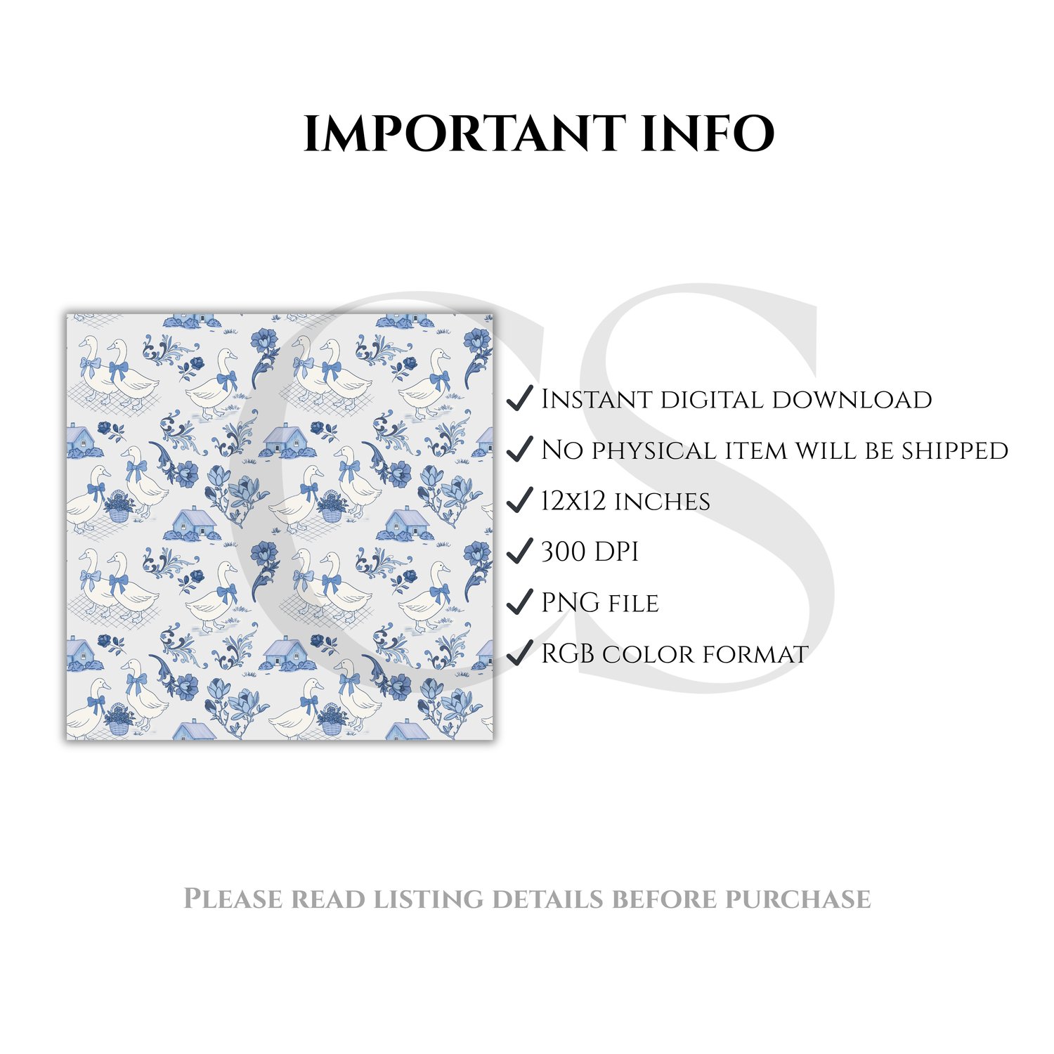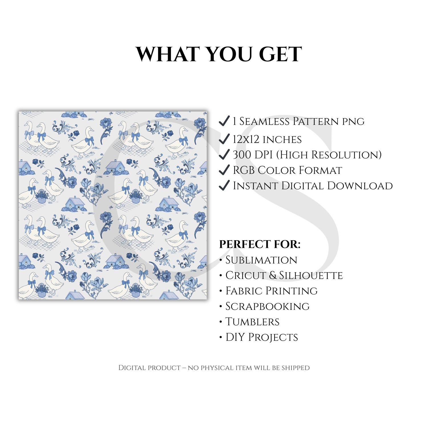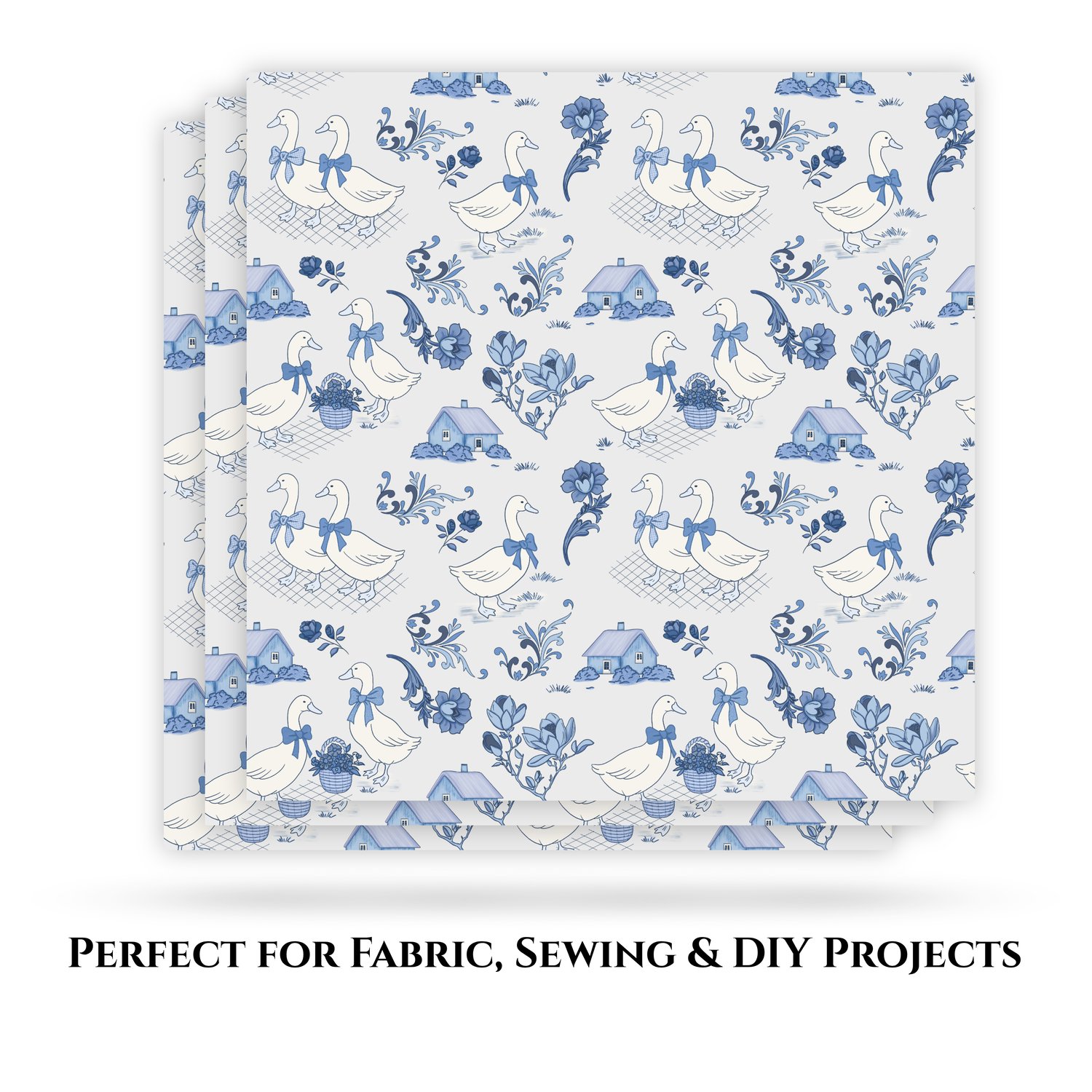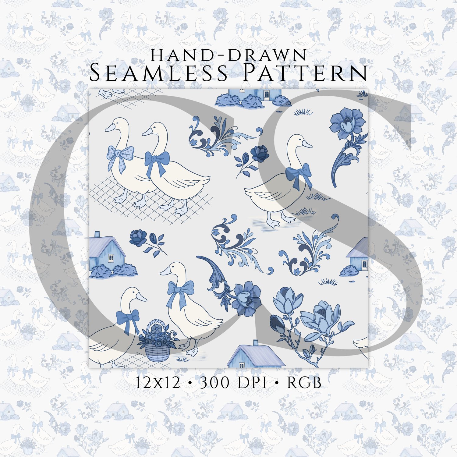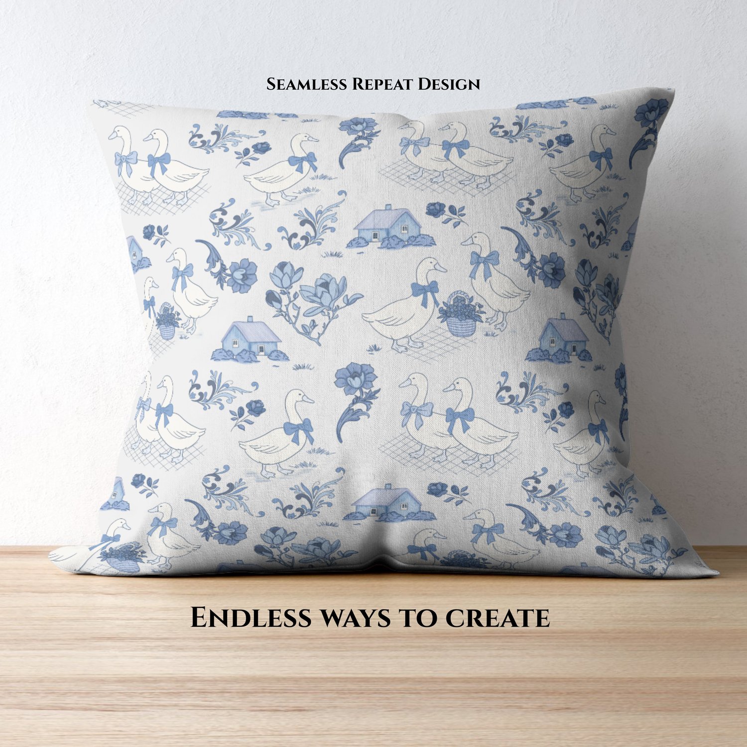 This seamless goose pattern captures the vintage French country look with a soft blue toile design. Perfect for fabric printing, farmhouse décor, scrapbooking, and crafting, this digital paper is a versatile essential for makers. Customers already love this design — now polished with mockups for fabric, home goods, and planners.