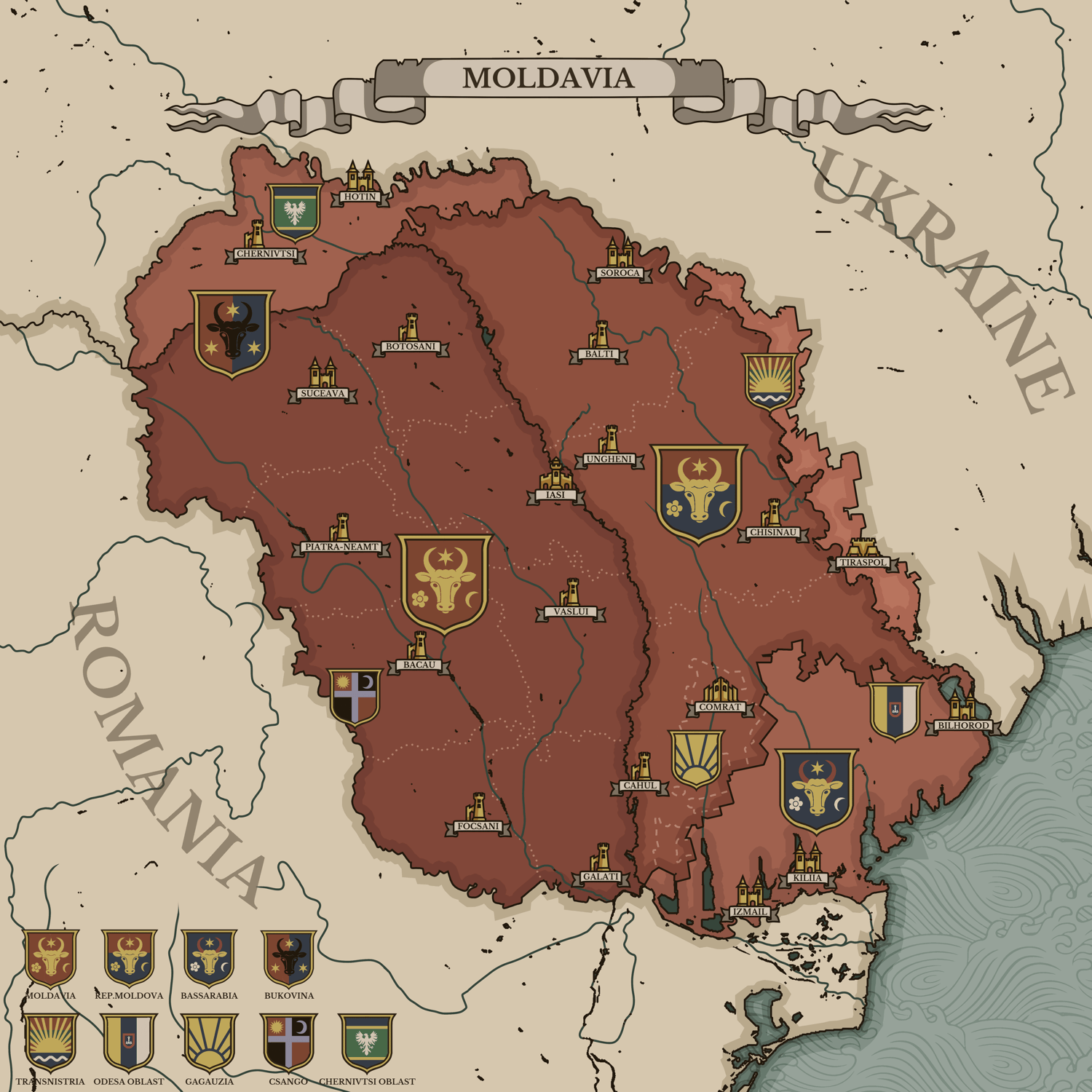 The historical territory of the Principality of Moldavia integrated with the contemporary administrative-territorial organization, alongside its heraldic symbols.