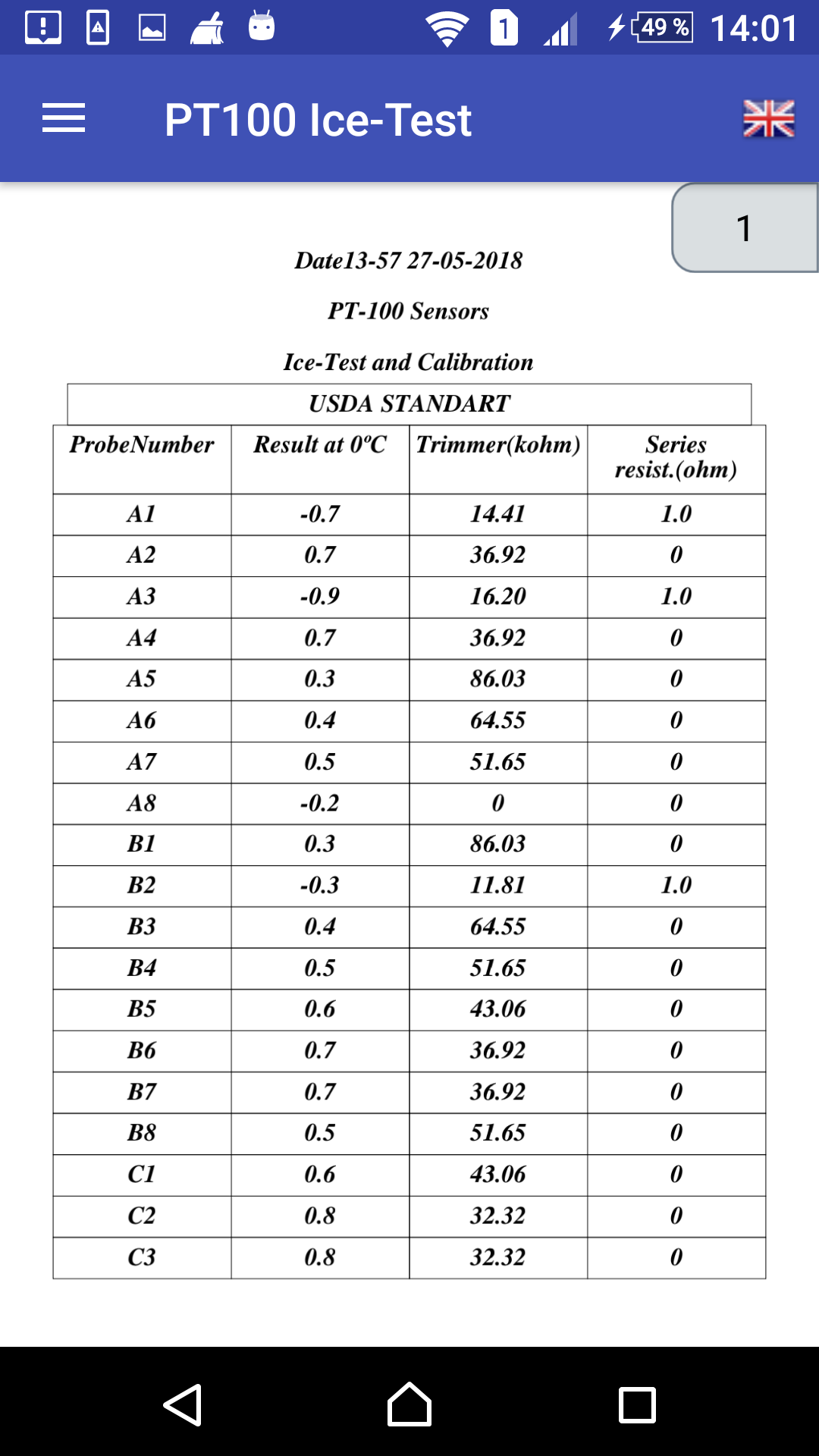The readings of the sensors placed in the ice-water mixture are recorded in a special application table. After that, the program calculates the resistance values of the calibration variable resistances and saves the results in a PDF file.