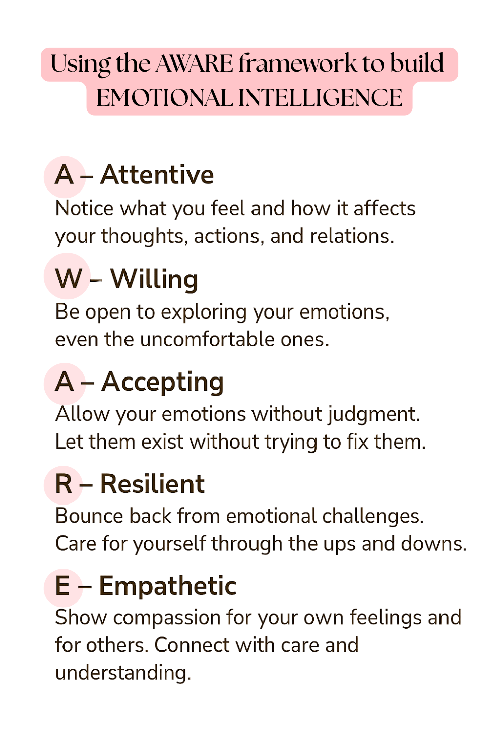 - The AWARE framework offers a simple, compassionate way to grow in emotional intelligence at your own pace.