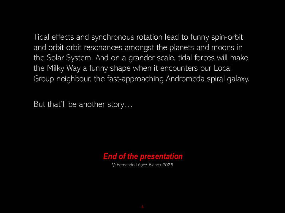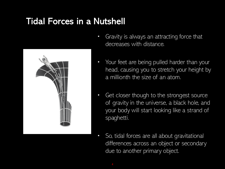 Tidal forces create the sea tides, trigger volcans in the Solar System, create beautiful rings around planets and squeeze us like spaghetti when we approach a black hole. Tidal forces make our day longer and relentlessly separate us from our Moon. If you want to learn why and how, don't miss this one out!