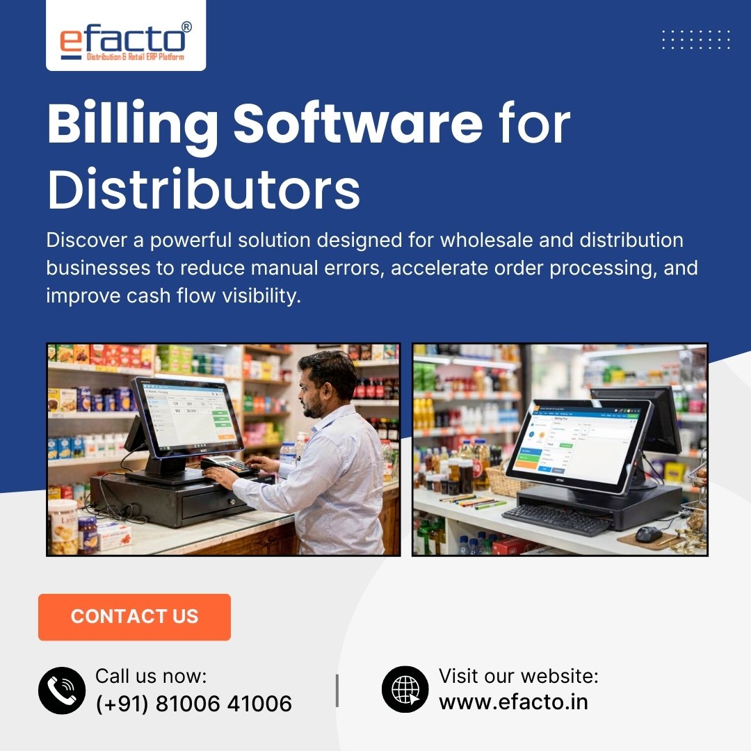 Looking for reliable billing software for distributors to manage bulk invoicing, stock control, GST compliance, and real-time reporting? Discover a powerful solution designed for wholesale and distribution businesses to reduce manual errors, accelerate order processing, and improve cash flow visibility. Ideal for FMCG, pharma, and supply chain operations, this billing software helps you scale efficiently while staying compliant with Indian tax rules. Explore smart automation features and grow your distribution business with confidence from Efacto.