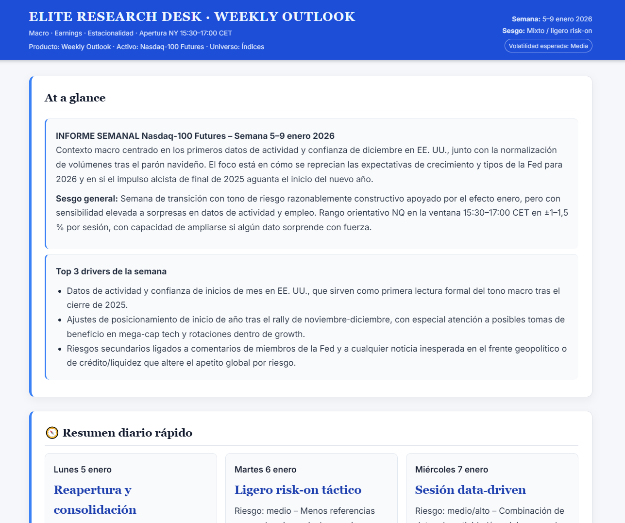 Elite Reports & Prompts es una membresía pensada para traders que quieren contexto profesional cada semana, sin señales ni ruido, para tomar mejores decisiones por su cuenta. Cada semana recibirás 9 informes en HTML (EURUSD, GBPUSD, Gold, Silver, NatGas, Crude Oil CL, NQ100, SP500 y DXY) con una estructura clara y repetible.