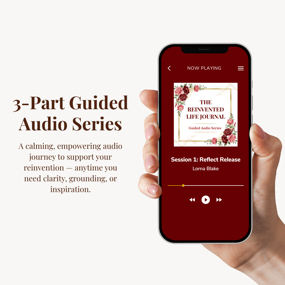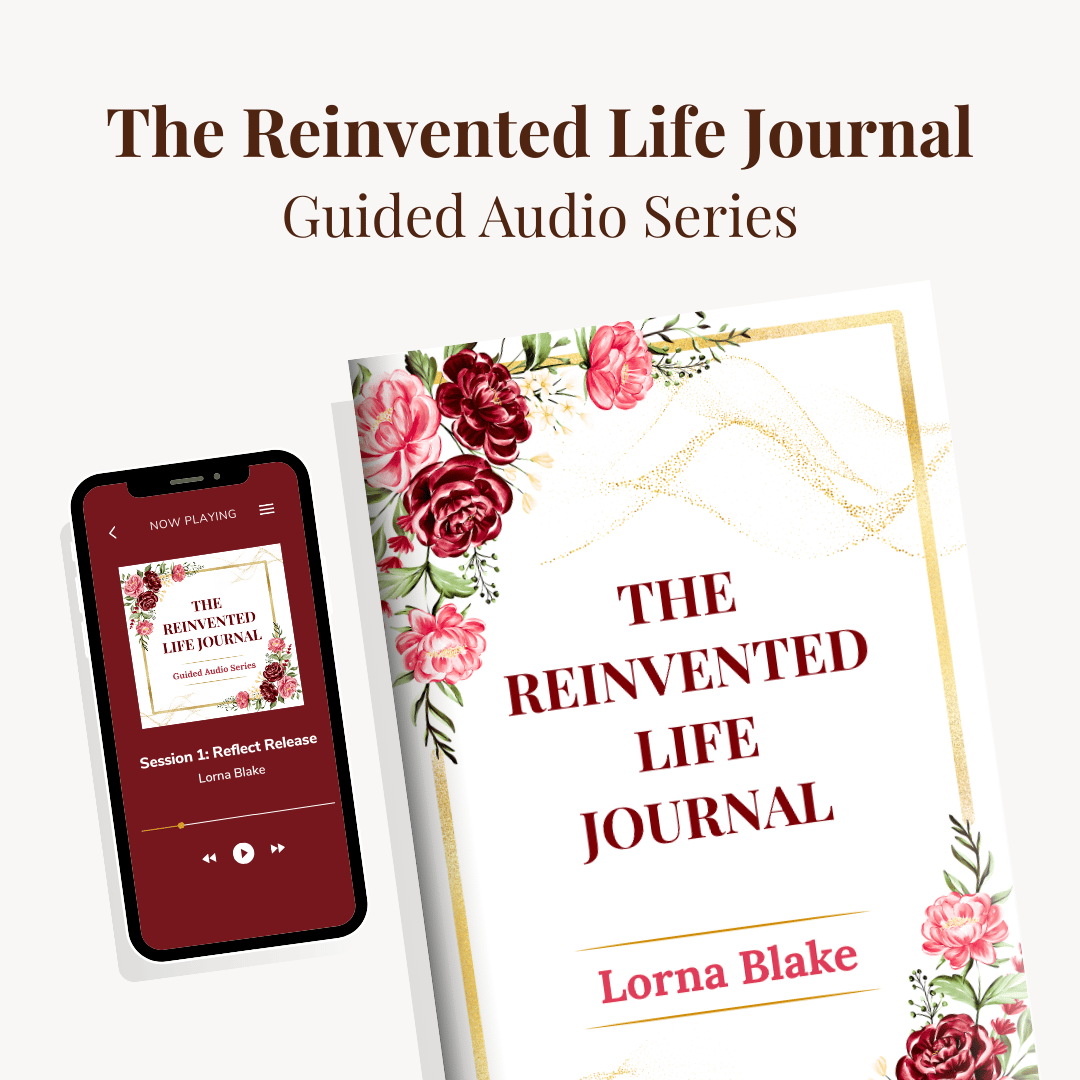 The Reinvented Life Journal is a 22-page guided journal designed to help women 40+ reflect on their past, release what no longer serves them, and realign with their purpose. It includes soul-stirring prompts, daily scripting pages, and space for deep inner work. Paired with a 3-part guided audio series, this experience offers gentle support through reflection, visualization, and daily empowerment as you step into your next chapter.
