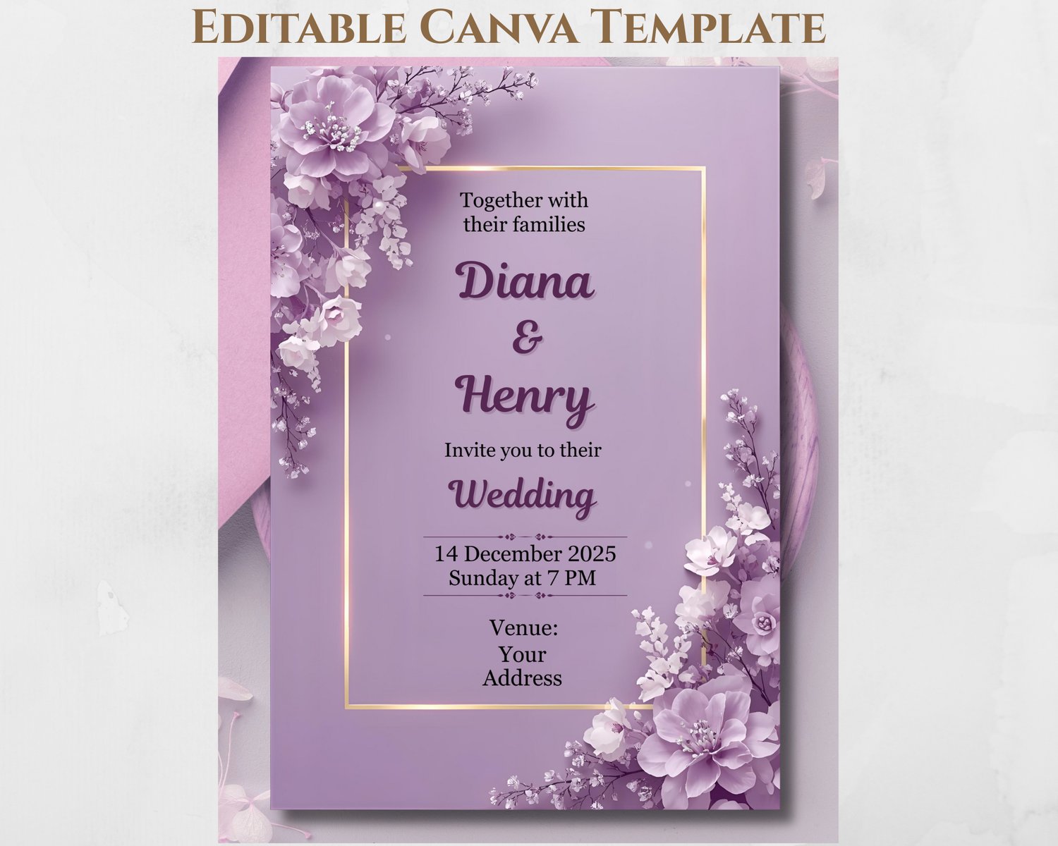 Elegant Purple Floral Wedding Invitation Template – Gold Frame – Editable Canva Digital Invite