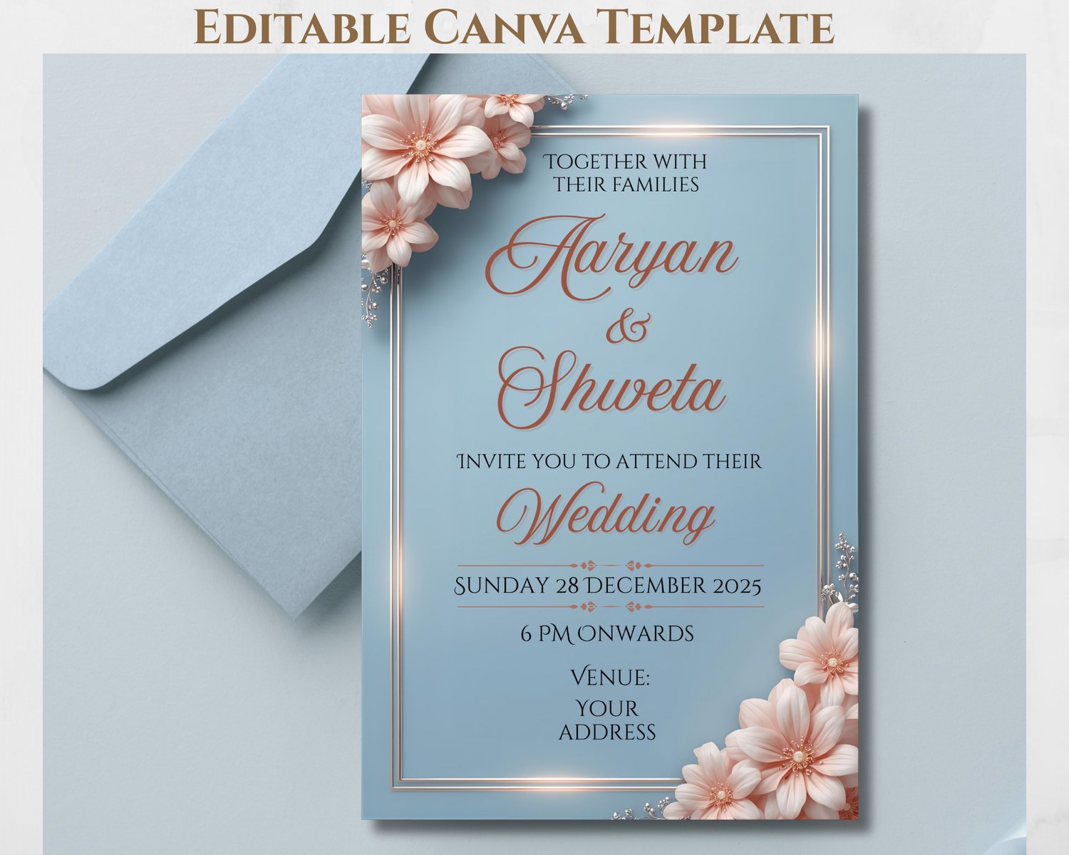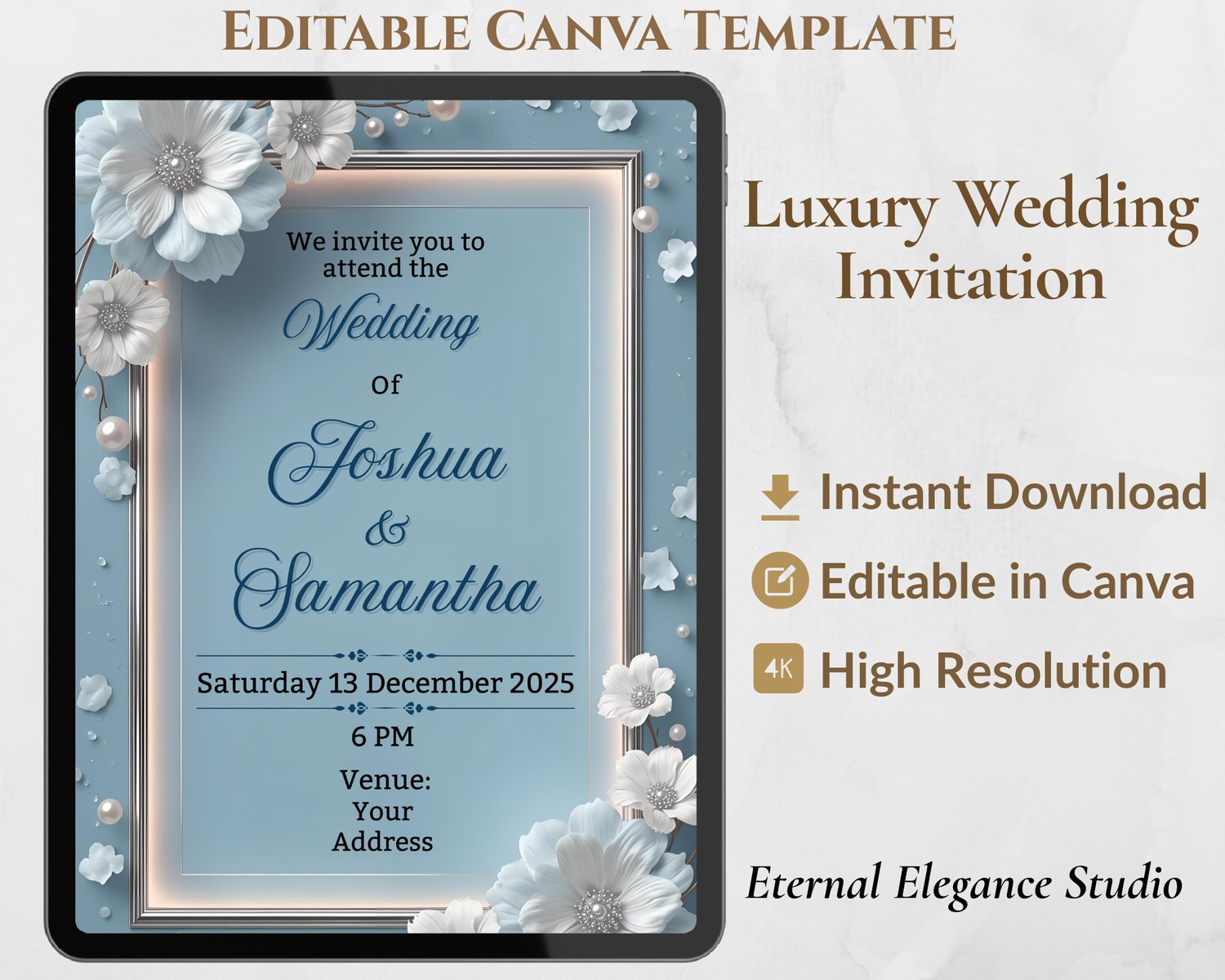 Elegant Blue Floral Wedding Invitation Canva Template | Editable Modern Wedding Card | Minimal Luxury Invite