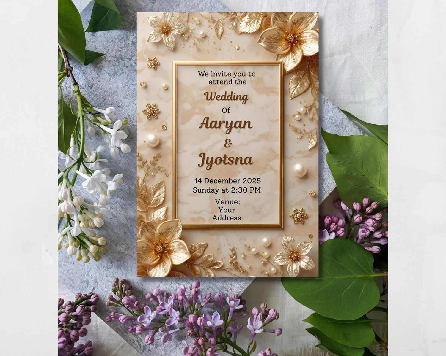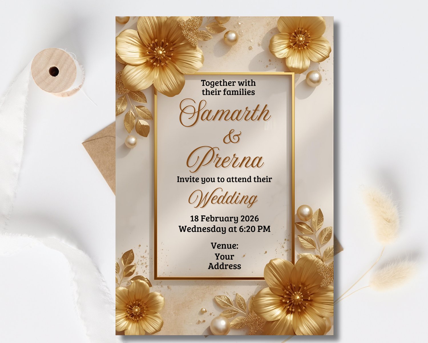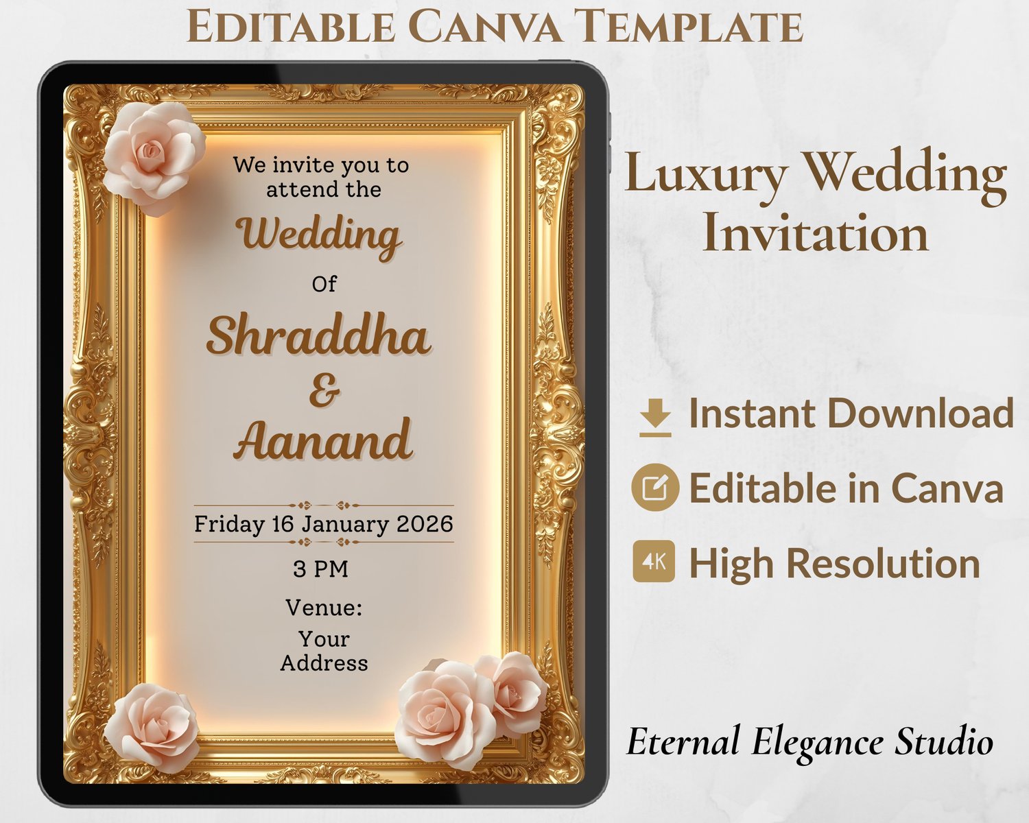 Luxury Gold Royal Wedding Invitation Canva Template | Editable Indian Wedding Card | Elegant Floral Frame Invite