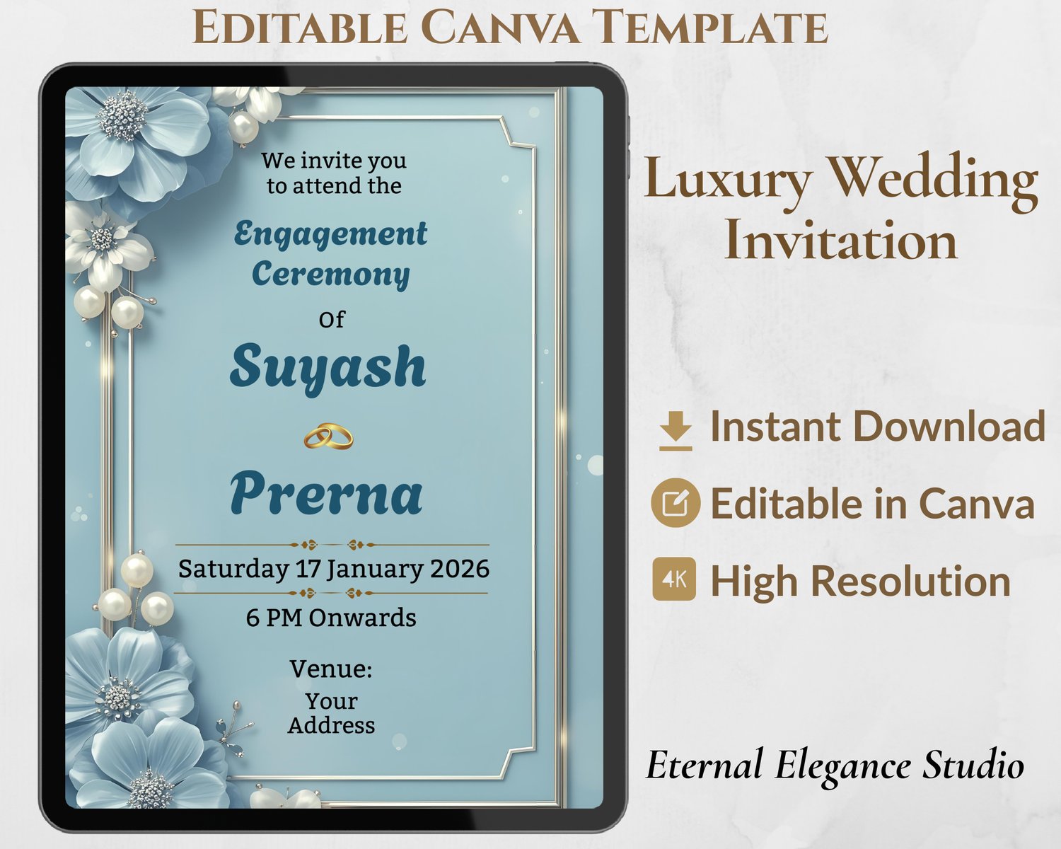 Elegant Blue Floral Engagement Invitation Template | Editable Canva Invitation | Modern Ring Ceremony Card | Digital Download