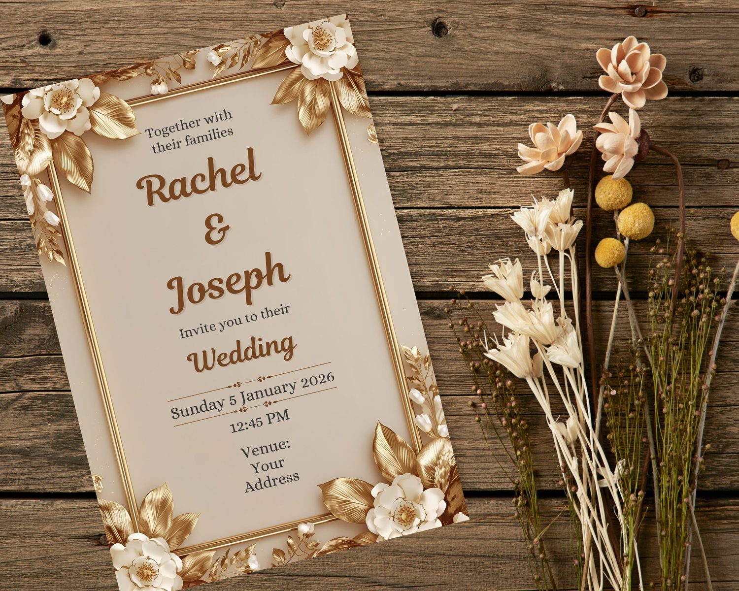 Elegant Gold Floral Wedding Invitation – Luxury 3D Frame – Editable Canva Template (Digital Download)