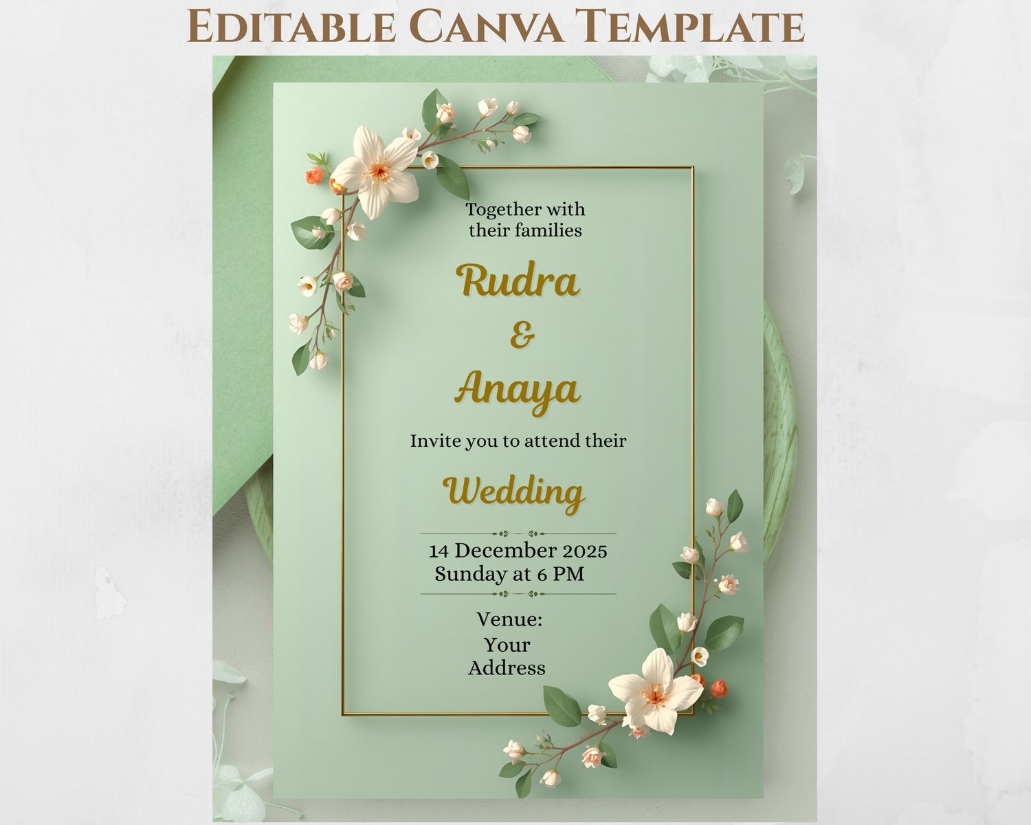 Elegant Sage Green Floral Wedding Invitation – Editable Canva Template – Modern Gold Frame Invite (Digital Download)