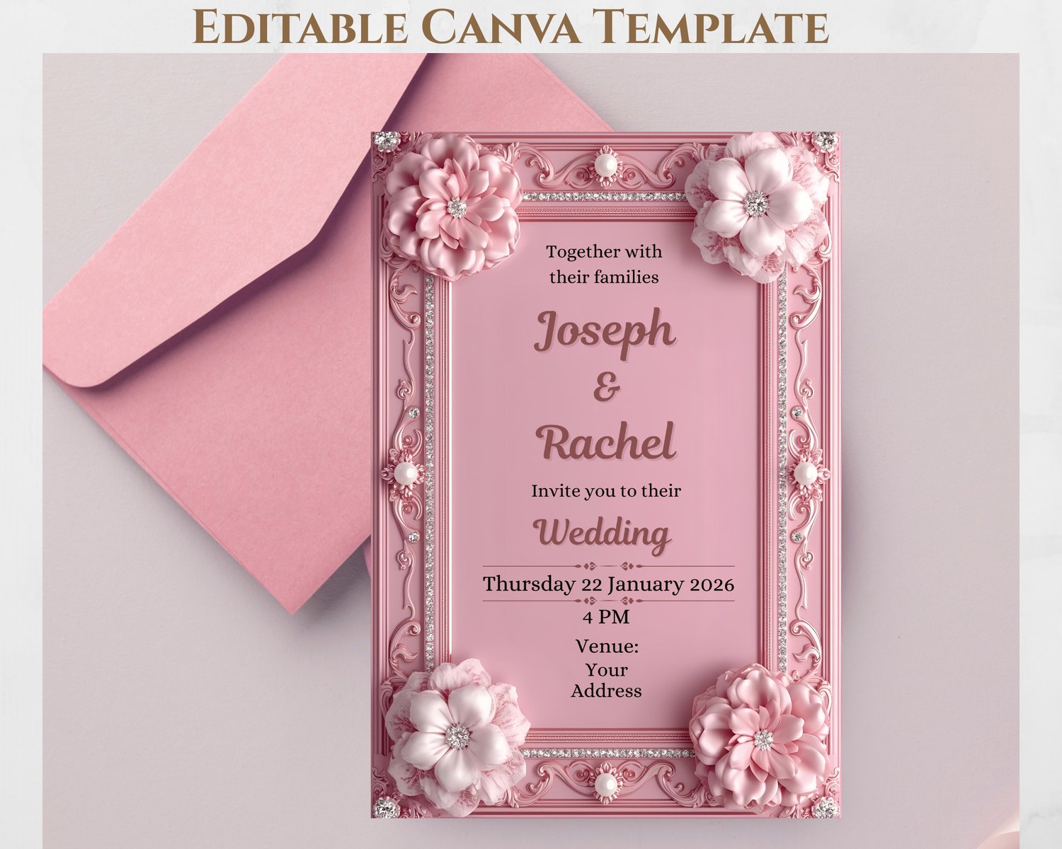 Elegant Pink Floral Wedding Invitation – Luxury 3D Frame – Editable Canva Template (Digital Download)