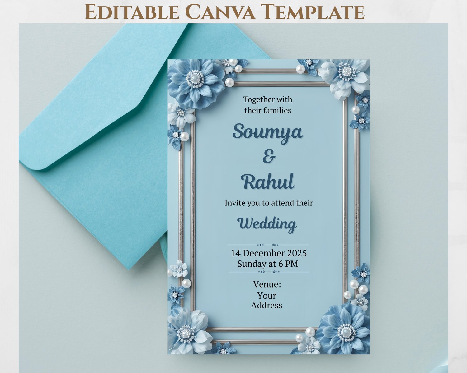 Elegant Blue Floral Wedding Invitation Template – Editable Canva Invite – Digital Download