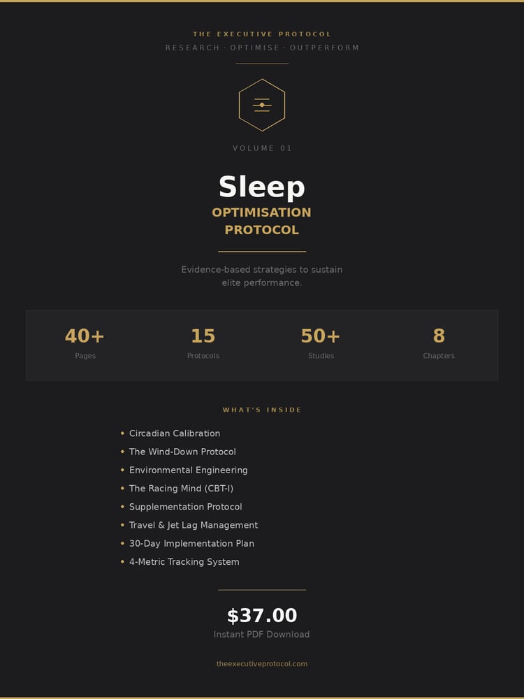 The Executive Protocol exists because the people who need the best research the most have the least time to find it. Every volume distils peer-reviewed evidence into actionable protocols for senior professionals — covering sleep, cognitive performance, stress resilience, and more. Built by a practitioner, not a guru. Researched like a consultancy brief, priced like a book.