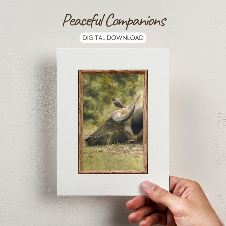 A rare moment of calm — a buffalo resting quietly with a mynah bird perched gently on its head, captured among the soft greens of grass and trees on Samosir Island in Lake Toba.