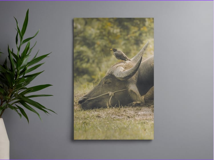 A rare moment of calm — a buffalo resting quietly with a mynah bird perched gently on its head, captured among the soft greens of grass and trees on Samosir Island in Lake Toba.