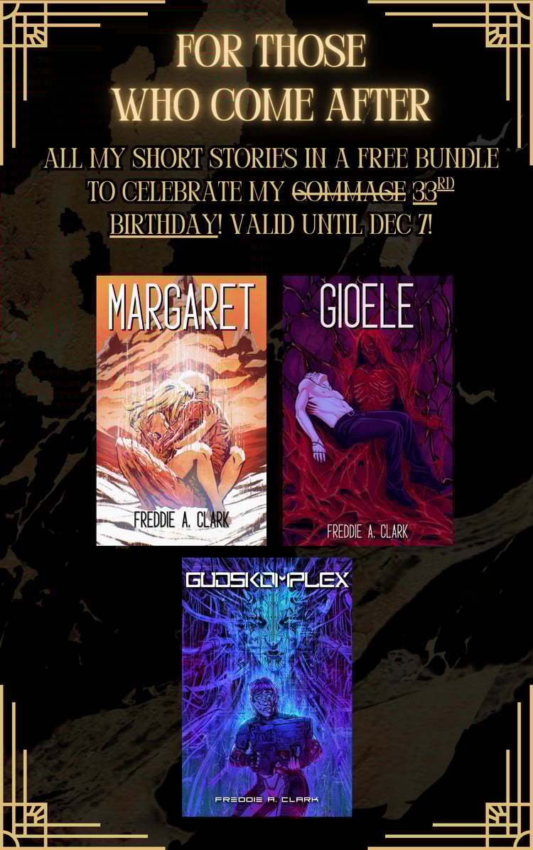 Freddie A. Clark writes Science Fiction, Grimdark and Horror with a Cyberpunk and biomech twist. Based in Milan, Clark lives with three cats, their partner, and a massive collection of Venetian masks. They draw their creativity from ‘80s aesthetic, movies and pop culture, and from an endless pile of books, graphic novels, manga and video games. The art of H.R. Giger and Zdzisław Beksiński influenced them immensely, took over their mind, and gave them the ability to spawn nightmares through words.