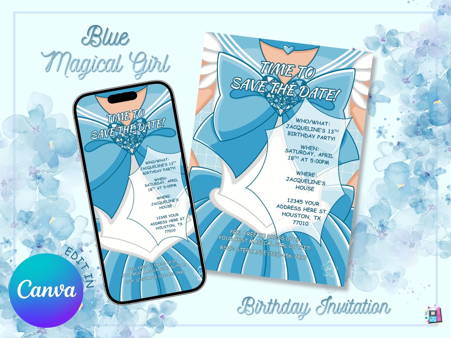 Blue Magical Girl Digital Birthday Party Invitation, Printable Invite, Editable Canva Template | Instant Download