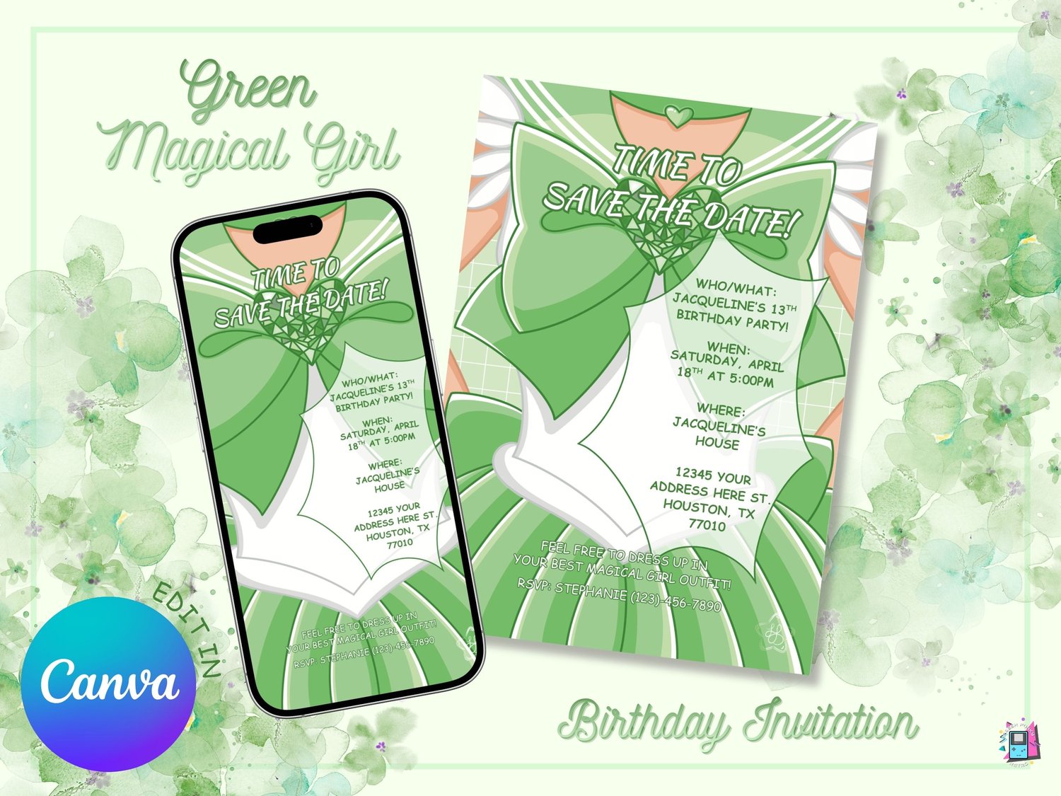 Green Magical Girl Digital Birthday Party Invitation, Printable Invite, Editable Canva Template | Instant Download