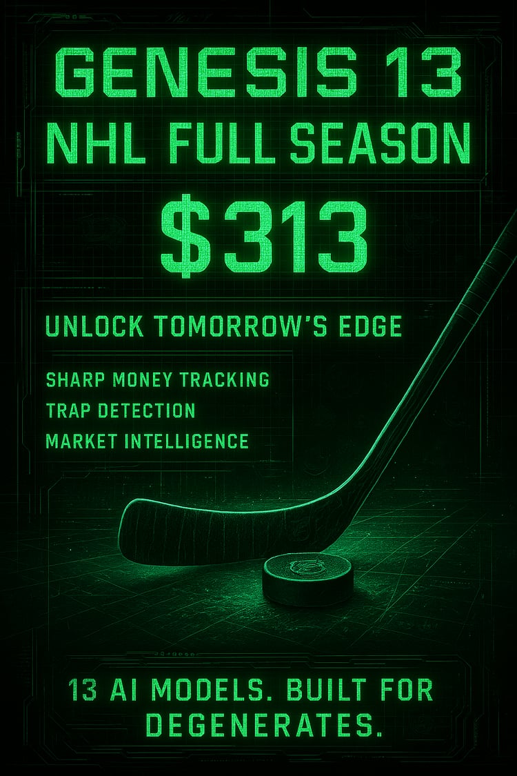 Born from frustration with overpriced “guru” picks and outdated handicapping strategies, Genesis 13 was designed to eliminate guesswork and emotional bias from your betting decisions. Our proprietary system combines 13 independent AI models, each focused on a key predictive domain. These models evaluate everything from market inefficiencies and power rating deltas to psychological momentum, rest patterns, referee tendencies, and rare outcome simulations.