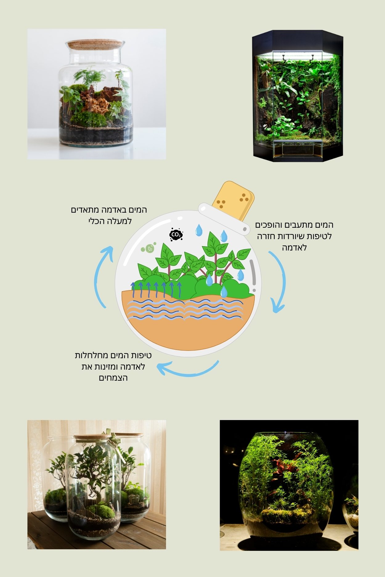 כשאתם מוסיפים לתוך כלי זכוכית מעט אדמה, צמחים, ועוד כמה מרכיבים קטנים בשילוב עם מעט מים כמובן נוצר אקלים ייחודי בתוך הצנצנת שמאפשר לצמחים שבפנים לצמוח ולשגשג!